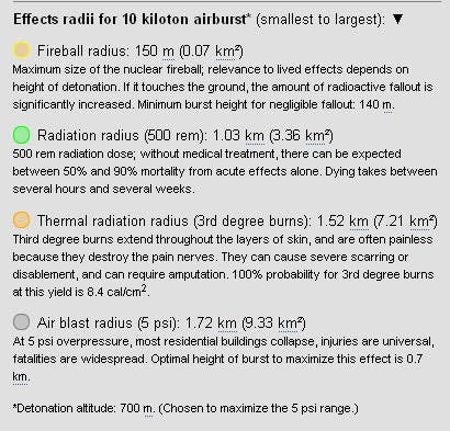 No círculo verde, estima-se que, sem tratamento médico, haveria uma taxa de mortalidade entre 50 e 90 por cento. No círculo laranja, o raio de radiação térmica, seriam registadas queimaduras de terceiro grau. No raio mais alargado poderia registar-se o colapso de muitos edifícios.
