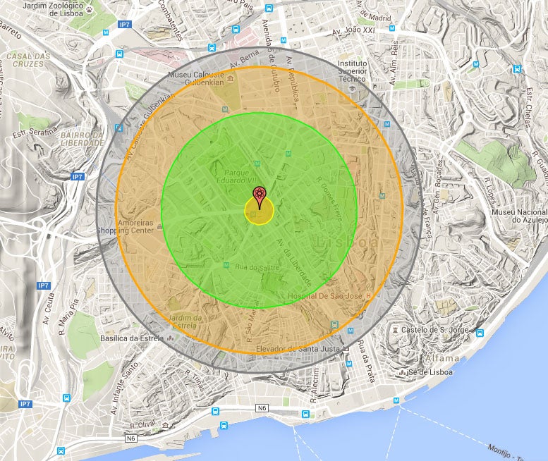 Imaginando que a detonação acontecia na Praça do Marquês de Pombal, em Lisboa, este seria o impacto estimado deste teste nuclear.