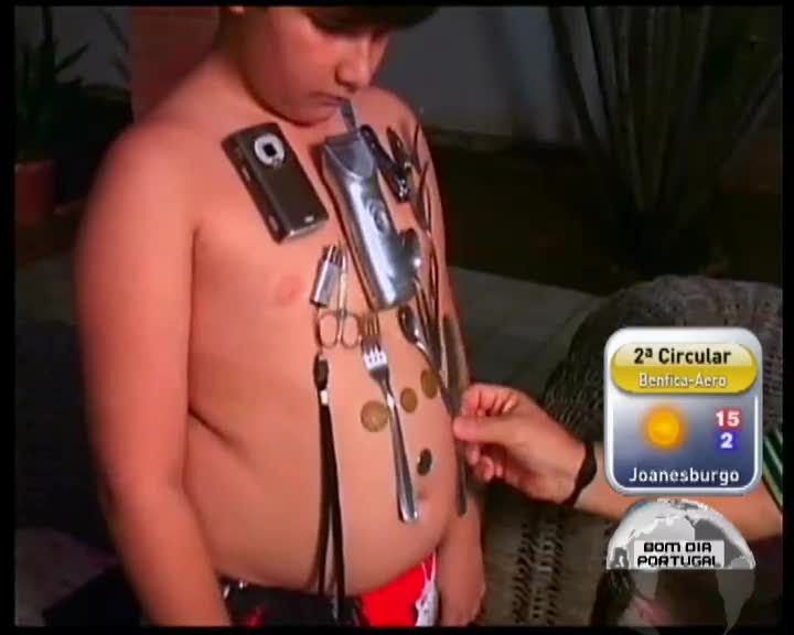 No Brasil um rapaz de 11 anos consegue atrair ao próprio corpo objetos de metal. Já lhe chamam o rapaz-íman . Os médicos, apesar do espanto, dizem que essa capacidade não é prejudicial à saúde.