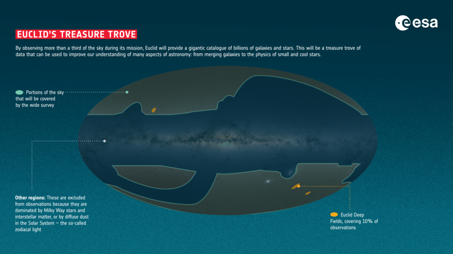 O Euclid vai tirar fotos em luz infravermelha e óptica; estas imagens acabarão por cobrir mais de um terço do céu extragaláctico fora da Via Láctea e retratar biliões de alvos cósmicos a uma distância em que a luz levou até dez mil milhões de anos para chegar até nós.
