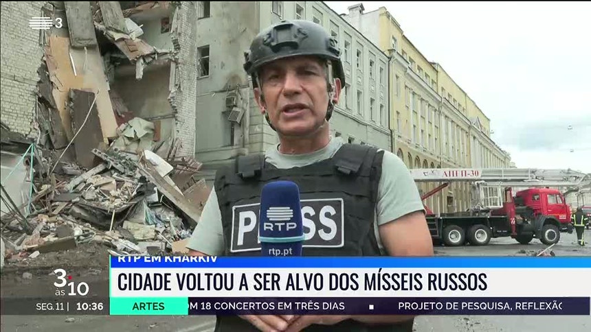 - Kharkiv, a segunda maior cidade da Ucrânia, voltou a ser alvo de ataques com mísseis russos na última madrugada. Um prédio civil e uma escola foram atingidos, testemunharam os enviados especiais da RTP António Mateus e Cláudio Calhau. Pelo menos uma pessoa está internada em estado grave.