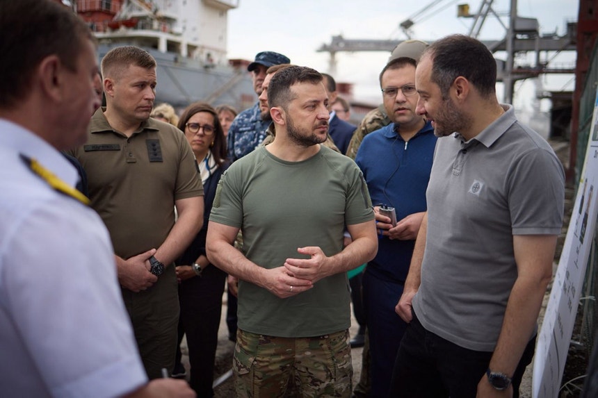 O gabinete de Zelensky referiu que o presidente visitou o porto de Chornomorsk, no Mar Negro, bloqueado pela Rússia, para ver os preparativos para os embarques sob o acordo intermediado pela ONU e assinado na Turquia na semana passada.