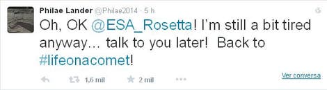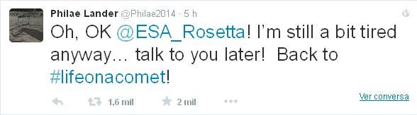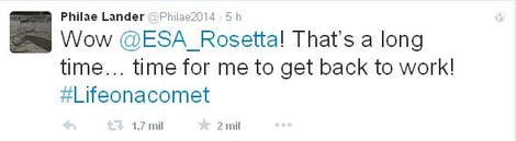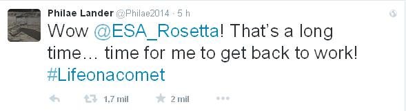 "A Philae está muito bem: tem uma temperatura de funcionamento de - 35º c e tem 24 Watts disponível," disse Stephan Ulamec, e como "ela" própria diz: É tempo de voltar ao trabalho".