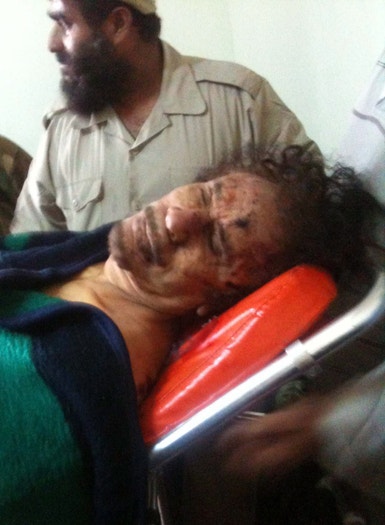 Não foram divulgados vídeos do momento da morte de Kadhafi e não é claro como é que ele recebeu a ferida mortal. Num primeiro vídeo difundido pela cadeia de TV Al-Jazira, aparece o corpo sem vida do ex-líder estendido no chão. Segundo um correspondente da Reuters era visível um buraco de bala num dos lados da cabeça. Algumas das imagens sugerem que o cadáver foi arrastado pelas ruas.