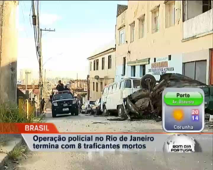 A polícia brasileira matou oito traficantes de droga. A operação aconteceu na " Favela Engenho" no Rio de Janeiro. As tropas do Batalhão de Operações Especiais estavam à procura destes homens que tinham fugido do "Morro da Mangueira". Durante a operação, apreenderam várias armas e granadas. Desde 2008, que as autoridades tentam pacificar a zona norte do Rio de Janeiro, por causa da Copa do Mundo e dos jogos olímpicos.