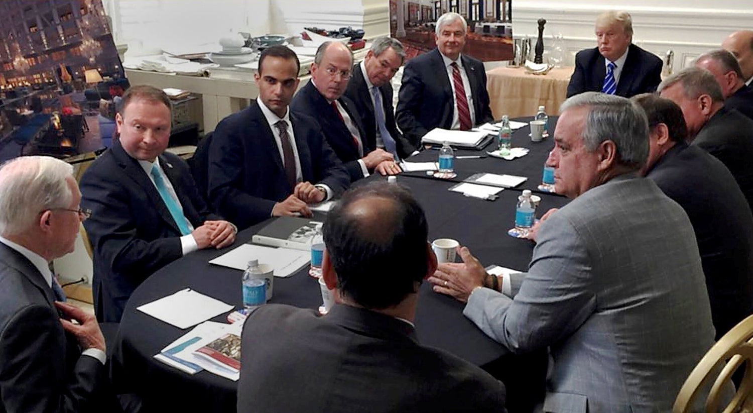Ou esta imagem que mostra George Papadopoulos sentado à mesa com Donald Trump.