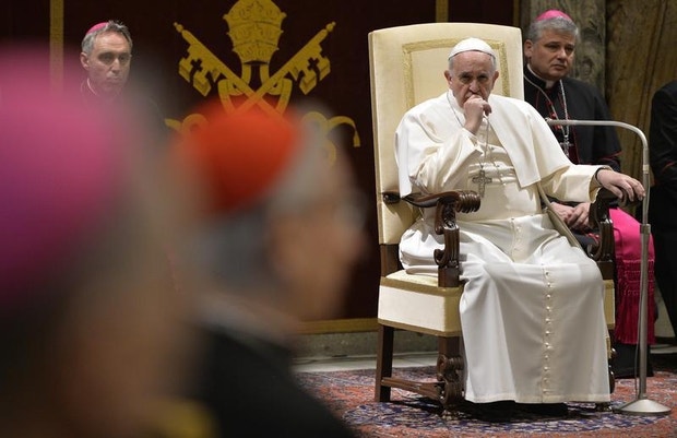O Papa Francisco criticou duramente a Cúria, denunciando nomeadamente o desejo de poder a qualquer preço, a vida dupla hipócrita e o "alzheimer espiritual" de muitos dos prelados, "que os fez esquecer que são supostamente alegres homens de Deus".