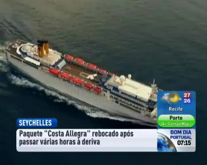O paquete "Costa Allegra", que estava à deriva ao largo das Seychelles, já começou a ser rebocado. O barco italiano com mil pessoas a bordo passou a noite à deriva no Oceano Índico. Entre os passageiros estão dois portugueses.