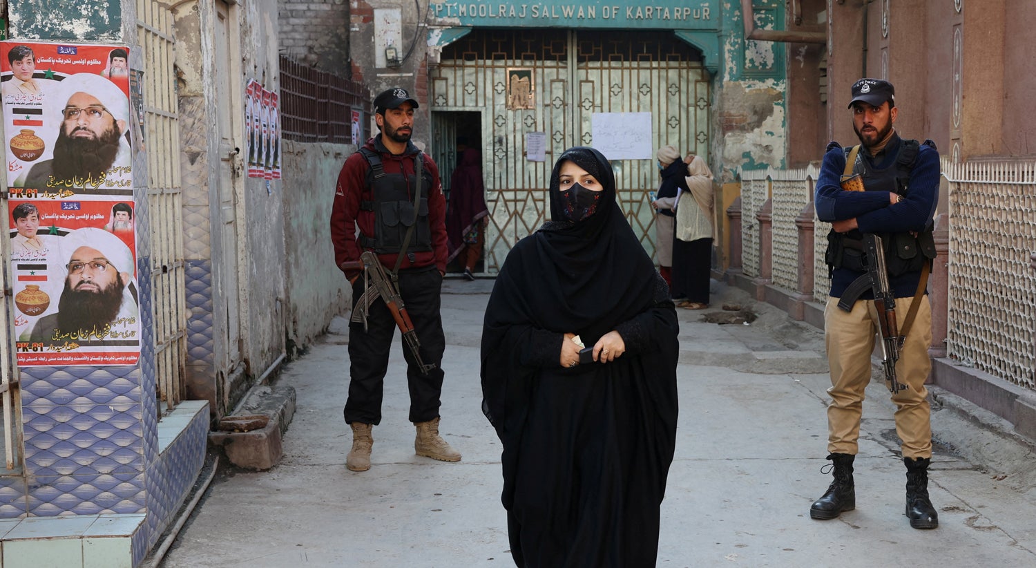 Eleitora chega para votar numa seção de voto em Peshawar, enquanto polícias garantem a segurança do local | Fayaz Aziz - Reuters