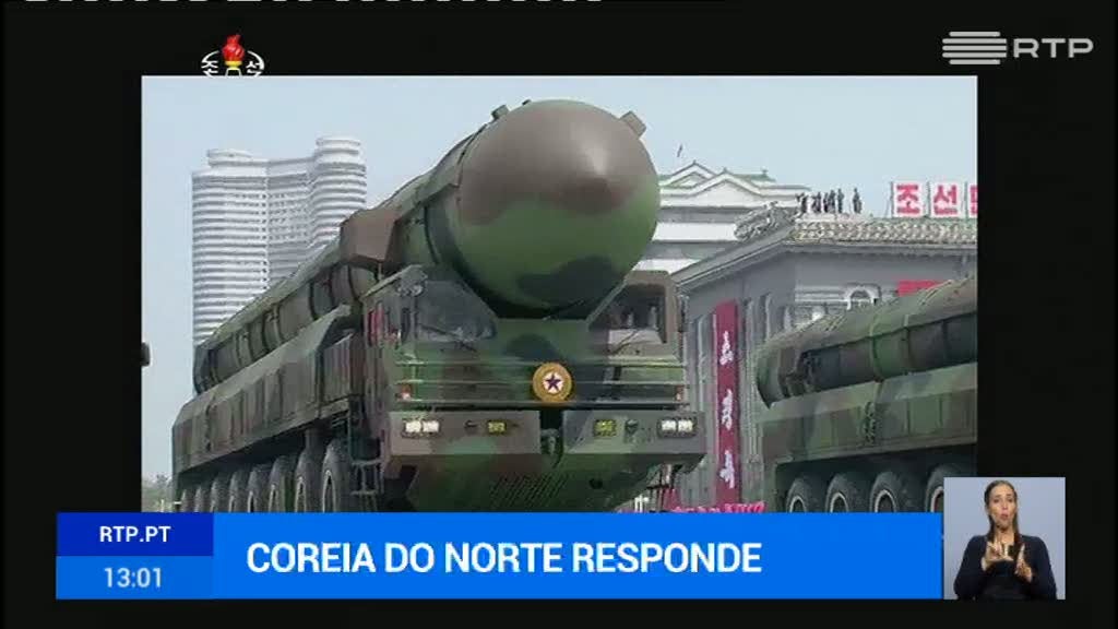 A Coreia do Norte promete "guerra total" a um possível ataque dos Estados Unidos. No desfile militar que assinalou o aniversário do nascimento do avô do atual dirigente Kim Jong-un, foram apresentados supostos mísseis com alcance intercontinental.