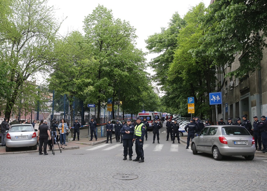 As autoridades receberam uma chamada telefónica a propósito de um tiroteio na escola Vladislav Ribnikar, por volta das 8h40, horário local (7h40 em Lisboa), referiram as autoridades policiais, que isolaram os quarteirões em redor.