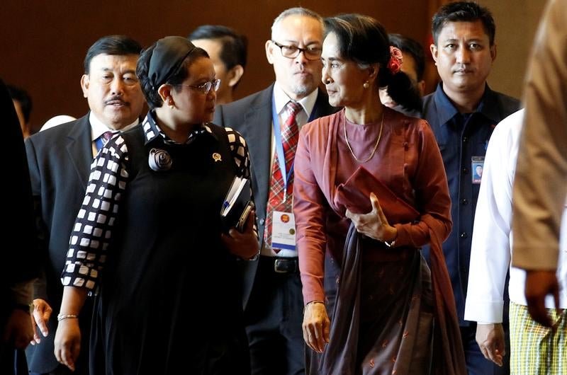Aung San Suu Kyi, vencedora do Nobel da Paz em 1991, ocupa vários cargos de destaque no país, incluindo o de conselheira principal e de ministra dos Negócios Estrangeiros, tem sido alvo de críticas por parte da comunidade internacional, que a acusa de inação perante a perseguição étnica dos Rohingya.