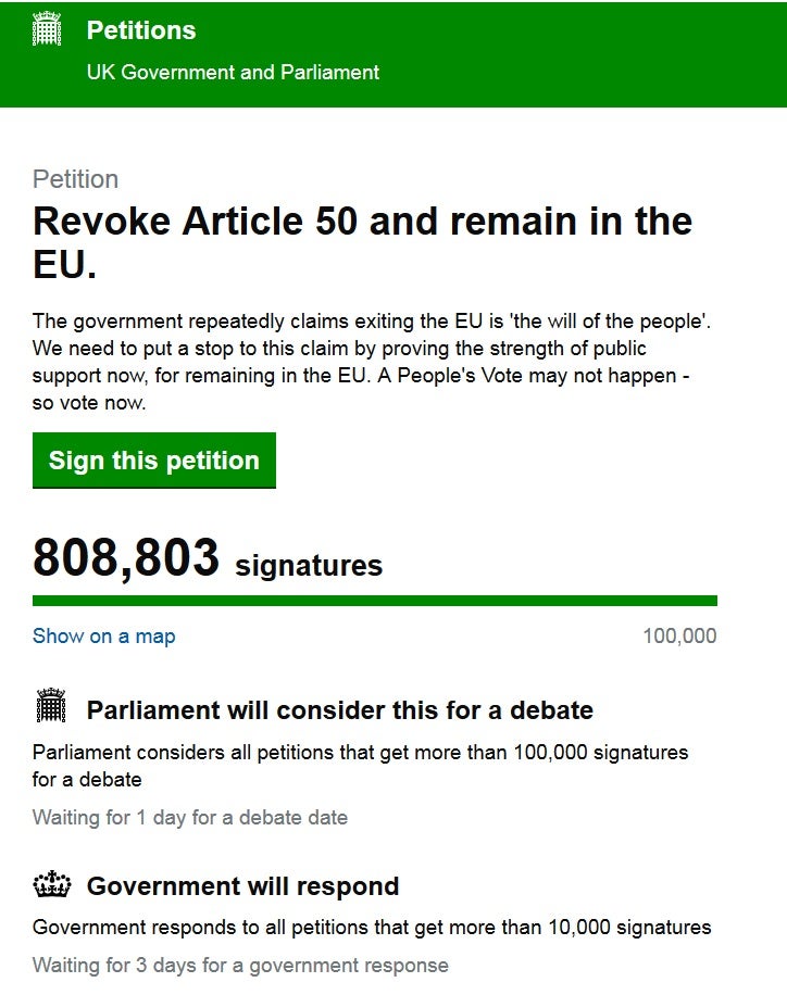 A petição “Revogar o Artigo 50 e permanecer na União Europeia” já tinha reunido as assinaturas de mais de 800 mil pessoas ao final da manhã de quinta-feira, tendo ultrapassado rapidamente a barreira das 100 mil pessoas. Isto significa que a petição terá de ser debatida pelo Parlamento Britânico.