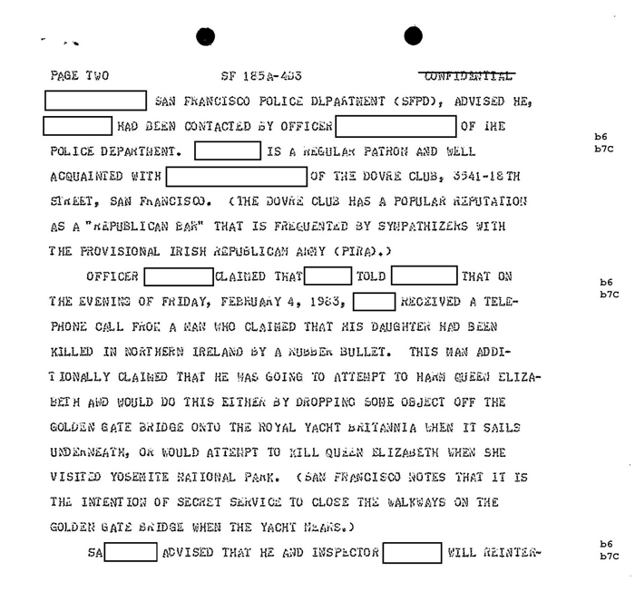 O FBI divulgou documentos que revelam como a polícia federal norte-americana procedeu perante ameaças de morte à rainha Isabel II durante várias viagens aos EUA. Uma delas aconteceu em 1983. A intimidação começou por ser feita a um polícia num bar irlandês, em São Francisco.