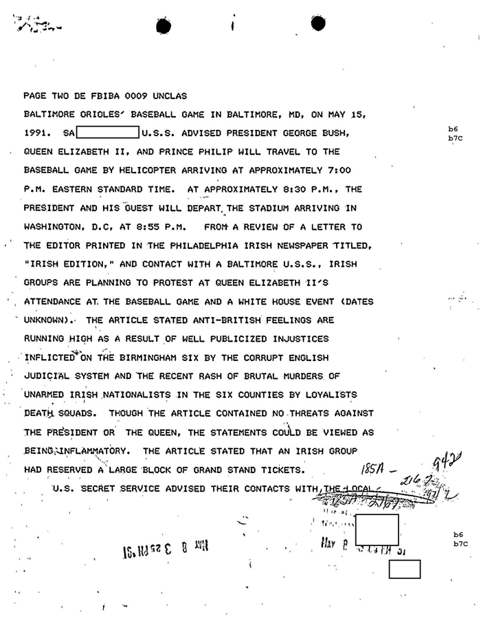 "Boston e Nova Yorque devem permanecer alerta para quaisquer ameaças contra a rainha Isabel II por parte dos membros do IRA e imediatamente fornecer as mesmas para Louisville", no Kentucky.