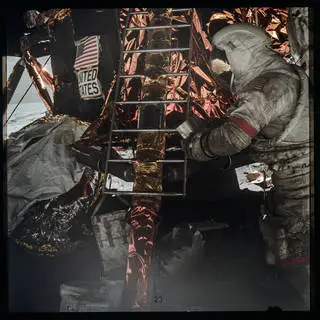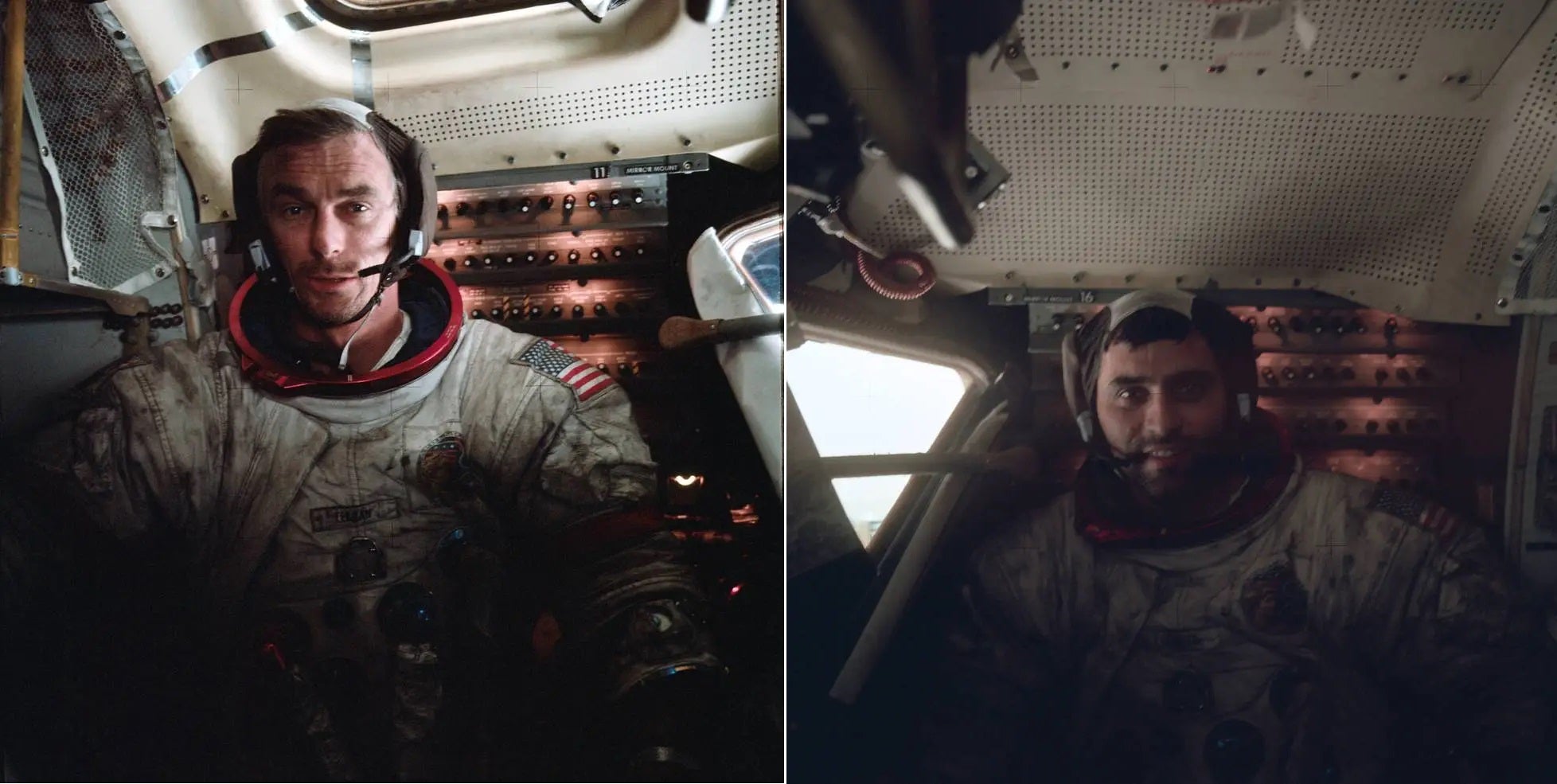 Fotos dos astronautas da Apollo 17, Eugene A. Cernan (Esq.) e Harrison H. "Jack" Schmitt (Dir.) após o regresso ao Módulo Lunar Challenger depois da terceira e última saída à superfície lunar, onde se pode ver os fatos cheios de pó lunar. Créditos: NASA