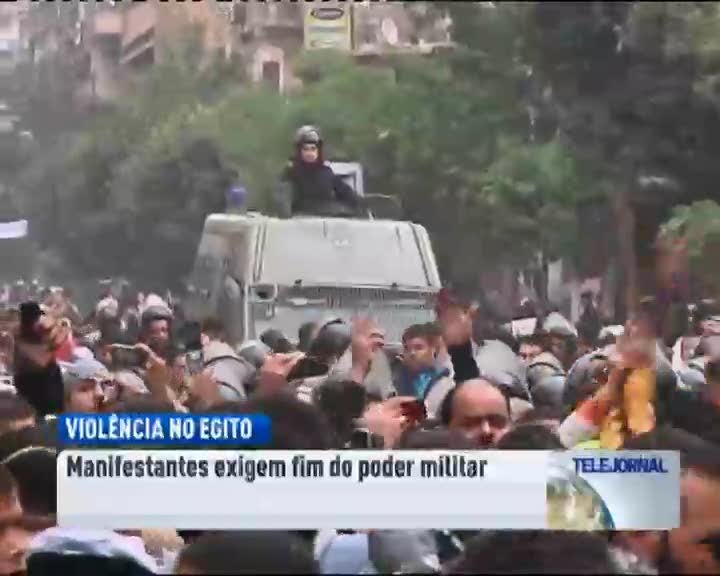 Os manifestantes exigem que os militares, que assumiram o poder depois da queda de Mubarak, anunciem o mais depressa possível uma data para a entrega das rédeas do país a uma administração civil.