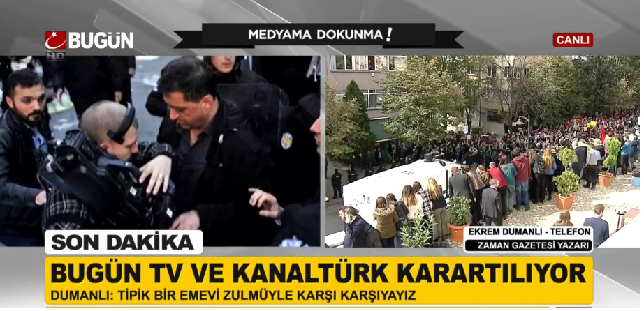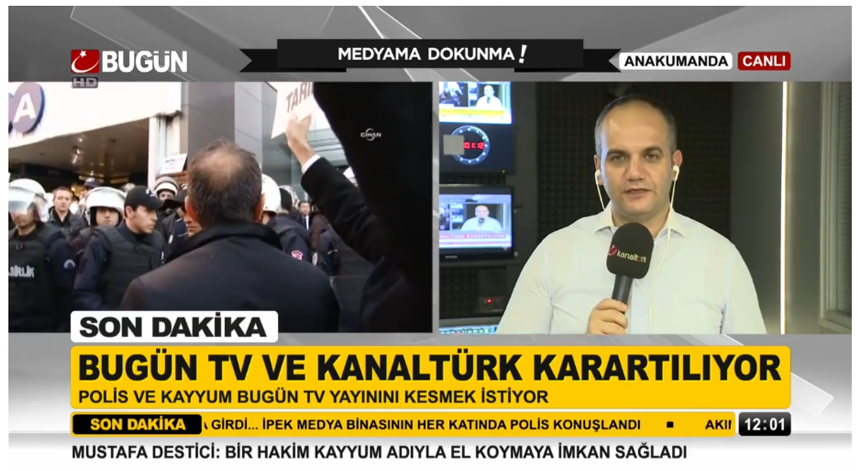 Acompanhado pela polícia, um grupo de administradores recém-nomeados pelo tribunal entrou depois nas zonas de controle de emissão de ambas as televisões, apesar dos protestos do editor princial da Bügun TV, Tarik Toros.