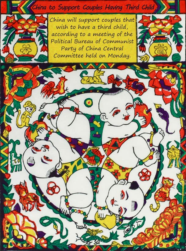 O jornal People's Daily, a emissora CCTV e a agência de notícias Xinhua publicam desde maio imagens de desenhos animados com crianças felizes, publicitando que a "nova política chegou".