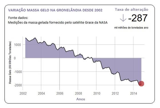 Também a zona geográfica do polo norte, a camada gelada da Gronelândia, tem sofrido alterações, registando-se uma perda estimada em 287 mil milhões de toneladas por ano.
