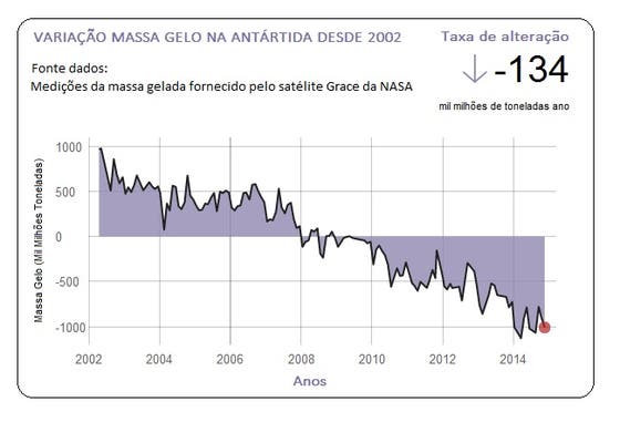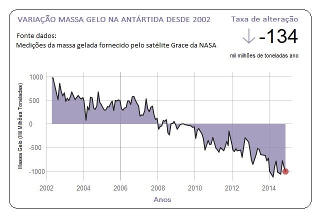 Desde 2002, as perdas têm sido praticamente constantes, sendo certo que a partir de 2008/2009 as massas dos dois continentes nunca mais conseguiram recuperar positivamente os valores volumétricos de gelo.
