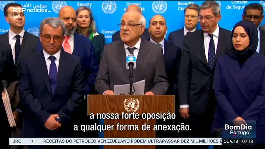 "Tais decisões são contrárias às obrigações de Israel perante o direito internacional e devem ser imediatamente revertidas. Sublinhamos, a este respeito, a nossa forte oposição a qualquer forma de anexação", diz a declaração lida à imprensa por Mansour, rodeado por dezenas de embaixadores, incluindo o de Portugal, Rui Vinhas.