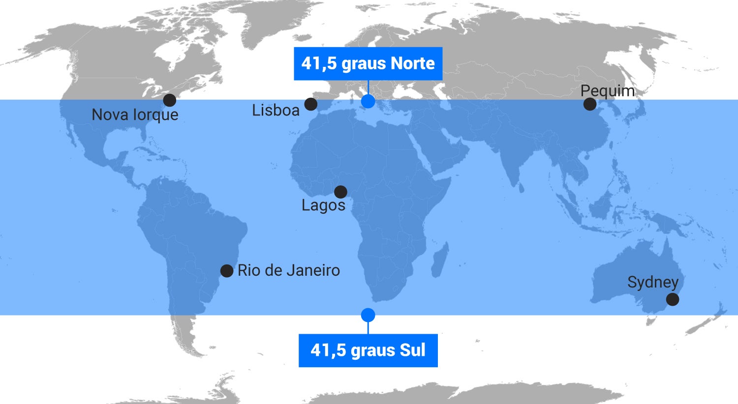 A zona assinalada a azul é a região onde orbita o CZ-5B, bem como a zona onde poderá cair | Infografia: Sara Piteira - RTP