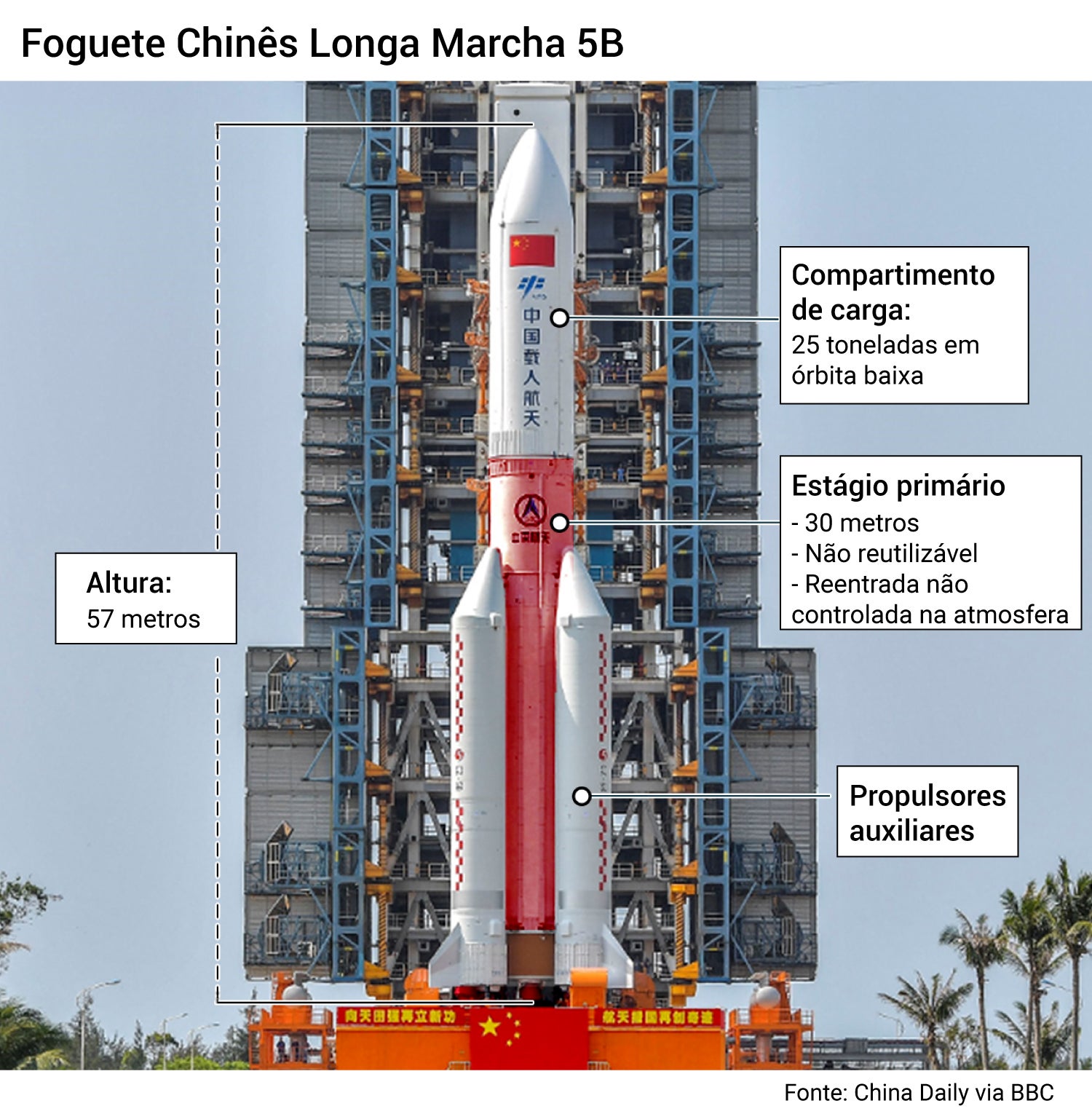 Contudo a preocupação com o CZ-5B é maior porque o tamanho do núcleo deste foguete é cerca de sete vezes maior do que o segundo estágio do Falcon 9.