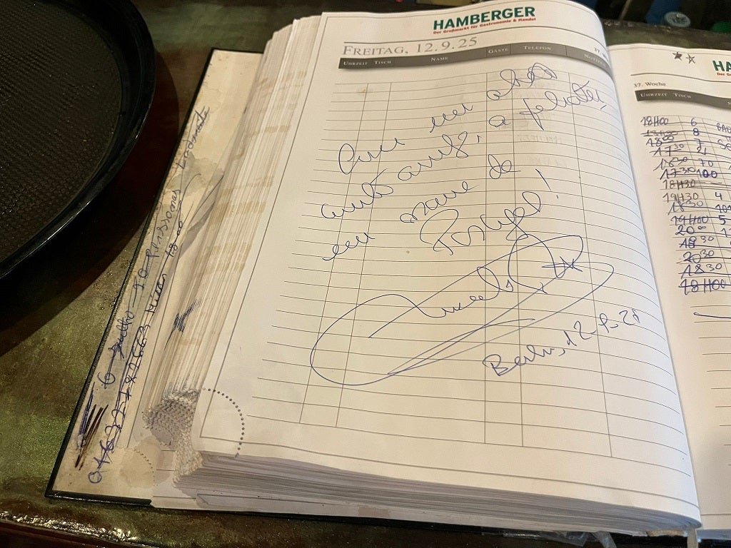O autógrafo deixado pelo PR no livro de reservas do restaurante