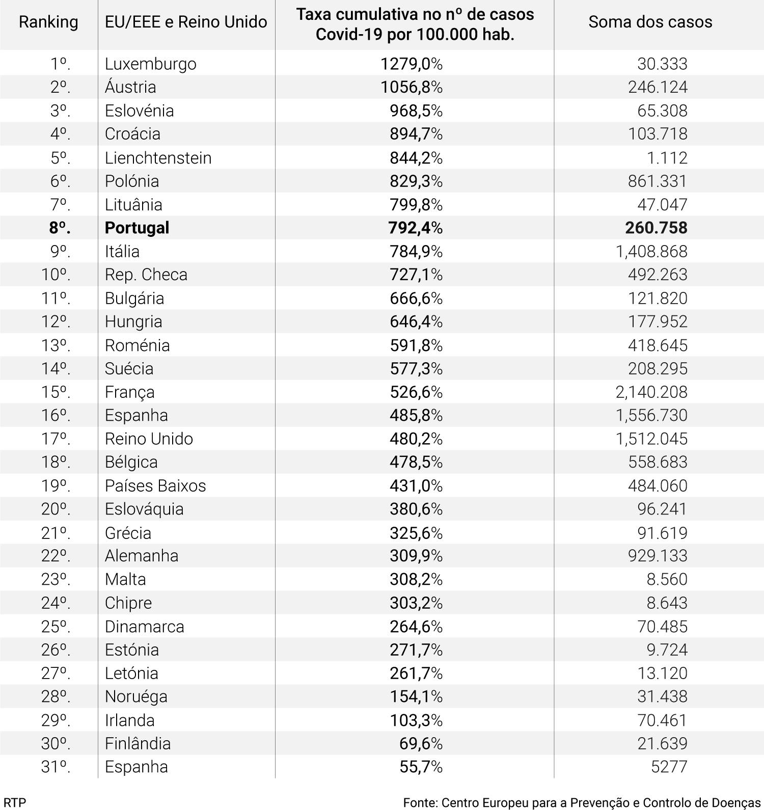 De acordo com os novos dados do Centro Europeu de Controlo e Prevenção de Doenças (ECDC) relativos aos últimos 14 dias, Portugal é o oitavo país da Europa com mais casos por cada 100 mil habitantes, passando à frente de países como Itália, Espanha e Bélgica. Quanto ao número de óbitos, Portugal fica em 14º no número de mortes por cada 100 mil habitantes.