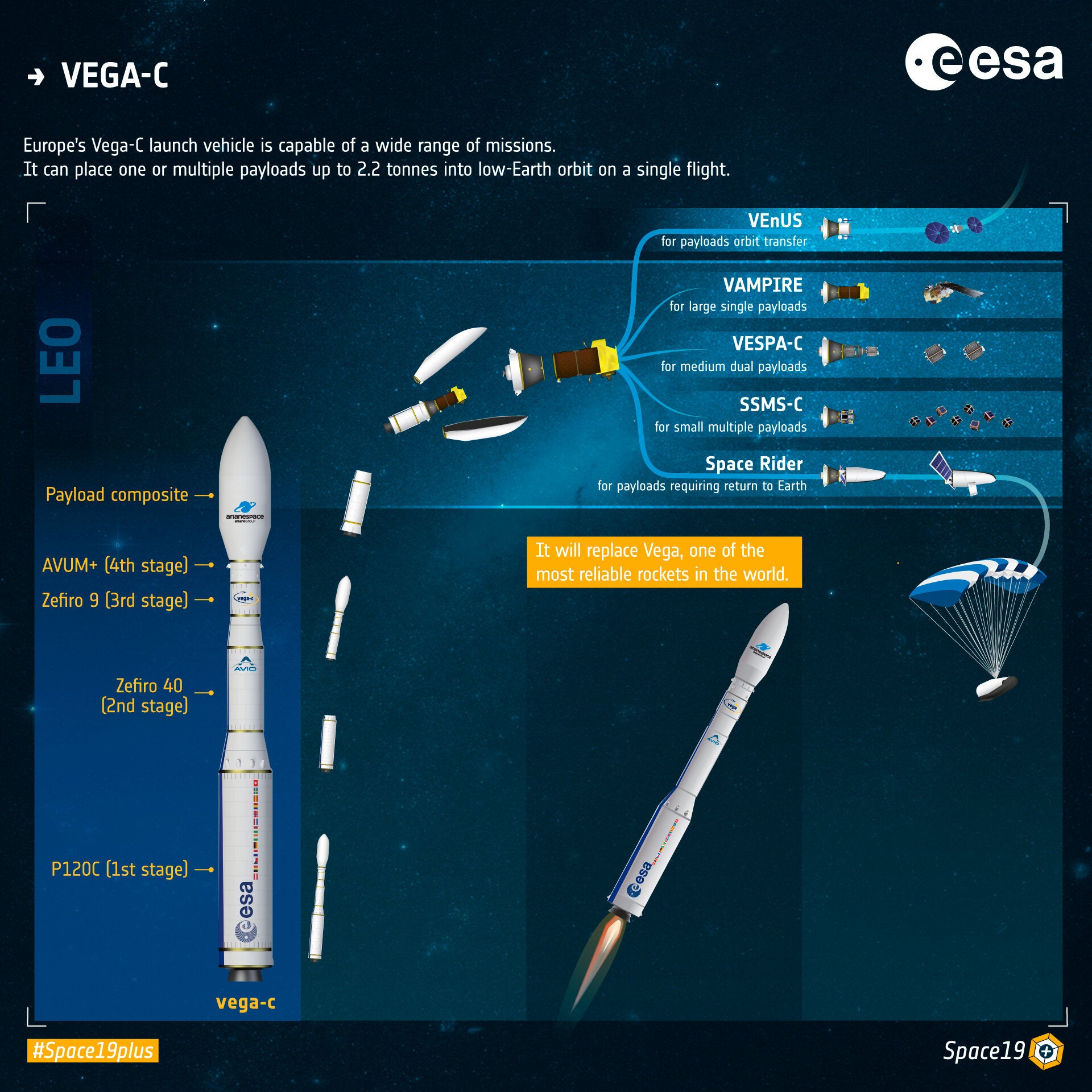 Este novo sistema de carga e transporte espacial será lançado através de um foguete Vega-C, que o levará até uma órbita ate dois mil quilómetros (orbita baixa terrestre).