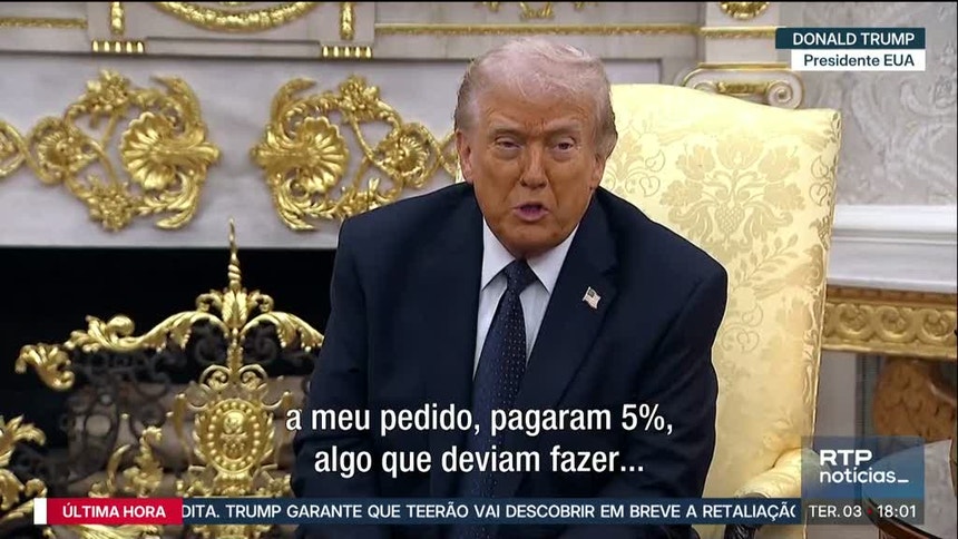 "Espanha tem sido terrível" porque "é o único país da NATO que não aceitou disponibilizar 5%" do seu PIB para as despesas de defesa, como exige a nova meta da NATO, disse o presidente norte-americano no Salão Oval da Casa Branca, ao lado do ministro dos Negócios Estrangeiros alemão Friedrich Merz.