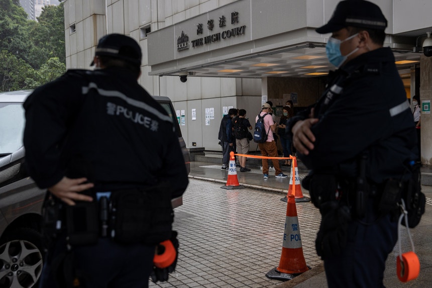 O juiz Ernest Lin Kam Hung falava no tribunal do distrito de Wanchai, após analisar a acusação apresentada pelo Ministério Público, no início do julgamento por um crime com uma pena mínima de cinco anos de prisão e uma pena máxima de 10 anos.