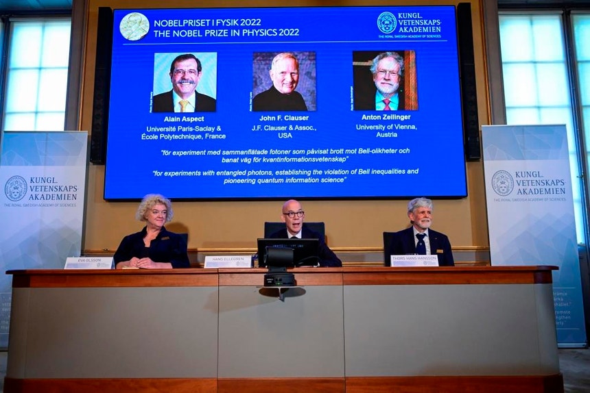 Allain Aspect, John Clauster e Anton Zeilinger foram anunciados em Estocolmo como os vencedores do Nobel da Física pelos avanços feitos em relação à mecânica quântica. De acordo com a Academia Nobel, os investigadores da Universidade Paris-Saclay (França), da J.F. Clauser & Assoc. (EUA) e da Universidade de Viena (Áustria), respetivamente, distinguiram-se “pelas experiências com fotões enredados, estabelecendo a violação das desigualdades de Bell e sendo pioneiros na ciência da informação quântica”.
