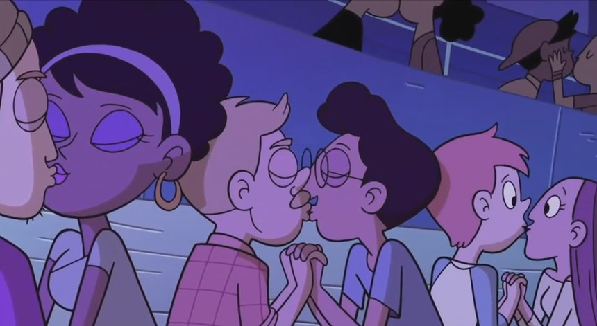 O momento aconteceu no último episódio da segunda temporada de Star vs the Forces of Evil, que foi para o ar esta segunda-feira nos Estados Unidos. No episódio, a protagonista Star vai a um concerto com o amigo Marco e a certa altura os dois personagens estão rodeados de casais a beijarem-se.