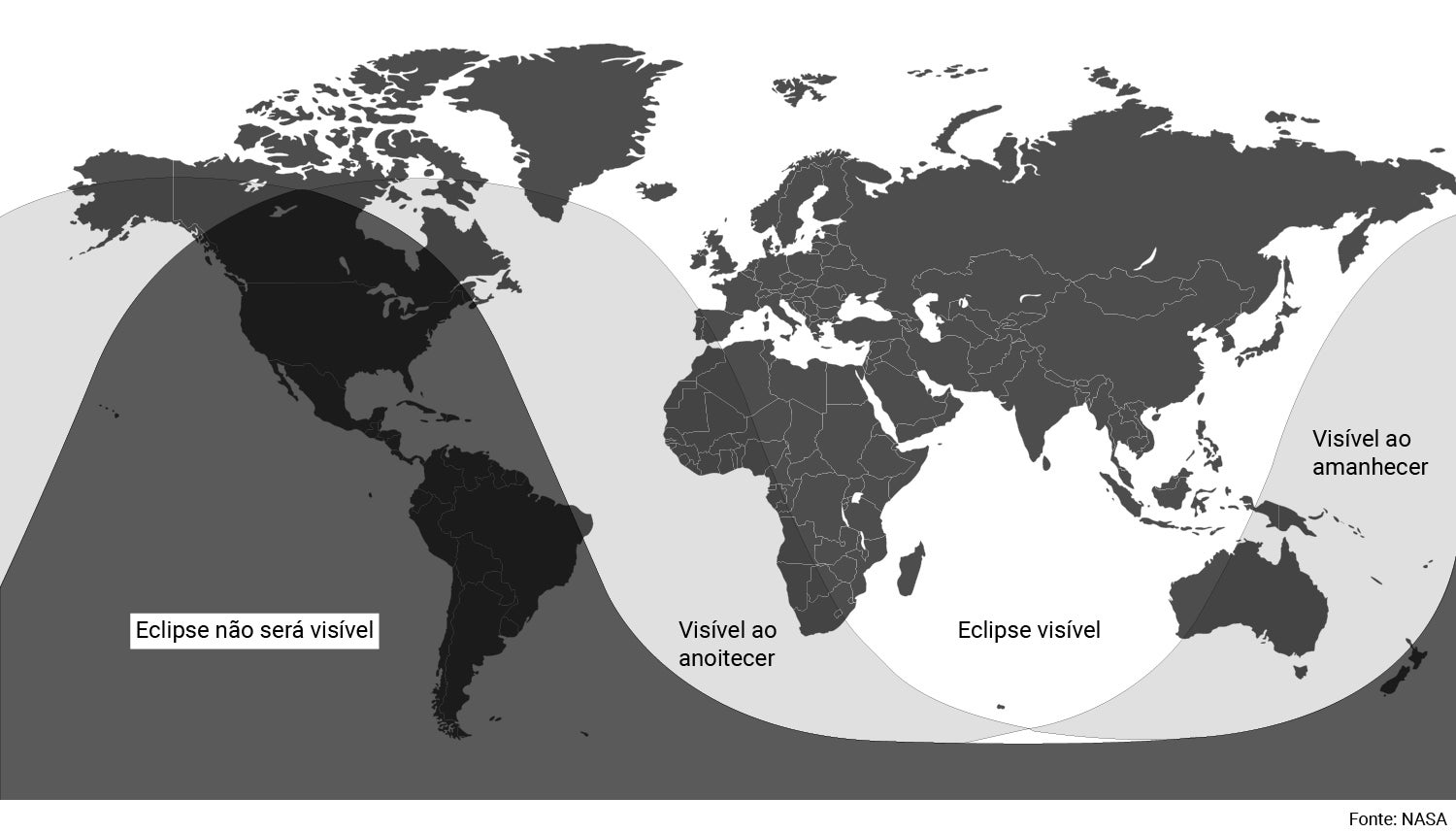 O eclipse será visível principalmente no Hemisfério Oriental, com países da Europa, África e grande parte da Ásia em posição privilegiada de visualização.