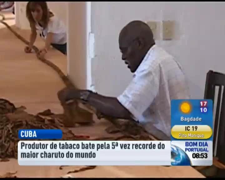Em Cuba, um produtor de tabaco entrou pela quinta vez para o Guiness Book, José Castelar fez o maior charuto do mundo, com 81 metros. Usou 90 quilos de tabaco. O produtor supera próprio recorde anterior, atingido com um charuto de quase 44 metros. José "Castelar" tem 67 anos e faz charutos desde a adolescência.
