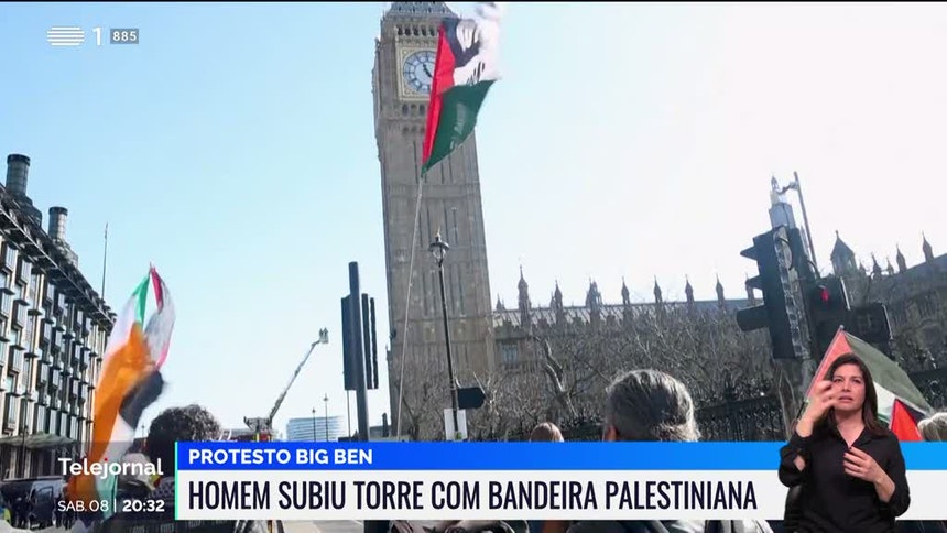 Um homem com uma bandeira palestiniana subiu à torre do Big Ben, no Palácio de Westminster, em Londres. O ativista exibiu a bandeira nuna das fachadas da torre enquanto gritava pedidos de libertação da Palestina.