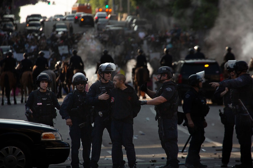 Foi decretado o recolher obrigatório na baixa de Los Angeles durante a noite. Foram já detidas centenas de pessoas e algumas acusadas de violência e vandalismo.