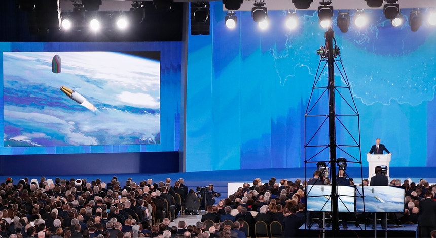 Ausente da campanha e do debate televisivo entre os candidatos às eleições presidenciais de 18 de março, o atual Presidente fez esta quinta-feira o discurso anual perante a Assembleia Federal da Rússia, onde explicou que o desenvolvimento de novas armas no arsenal militar russo são a resposta à retirada dos Estados Unidos, em 2002, do Tratado sobre Mísseis Antibalísticos, assinado em 1972 com a União Soviética.