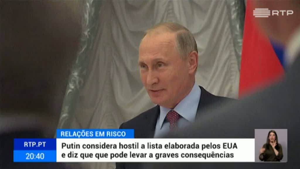“Já esperávamos esta lista e, não o vou esconder, estávamos decididos a uma forte retaliação, passos que reduziriam as nossas relações a zero. Mas neste momento vamos abster-nos de dar esse passo”, revelou Putin, que chamou à argumentação os denominados países do Eixo do Mal (designação que ficou dos tempos de George W. Bush e que inclui a Coreia do Norte, Irão e Síria).