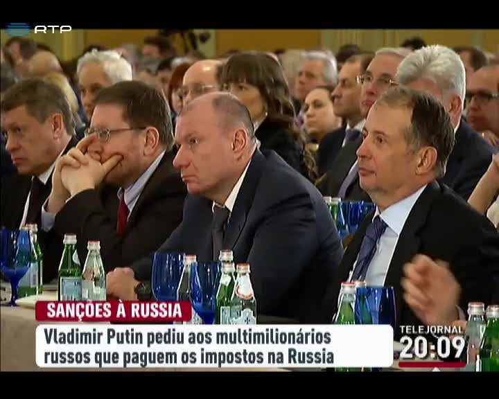 O presidente russo pediu aos multimilionários russos que paguem os impostos para ajudar o país a enfrentar as sanções vindas do Ocidente. Vladimir Putin reuniu-se em Moscovo com os homens mais ricos da Rússia. Num discurso de união contra o Ocidente, Putin pediu aos empresários para manterem a sede dos negócios em território russo e pagarem os impostos na pátria - esta a resposta de Moscovo as ameaças de sanções dos Estados Unidos e da União Europeia. A Rússia diz que vai aplicar sanções também contra responsáveis políticos norte-americanos.