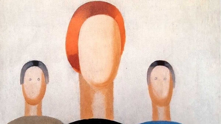 A pintura, datada da década de 1930, mostra três torsos e cabeças com cabelos, mas sem traços faciais.