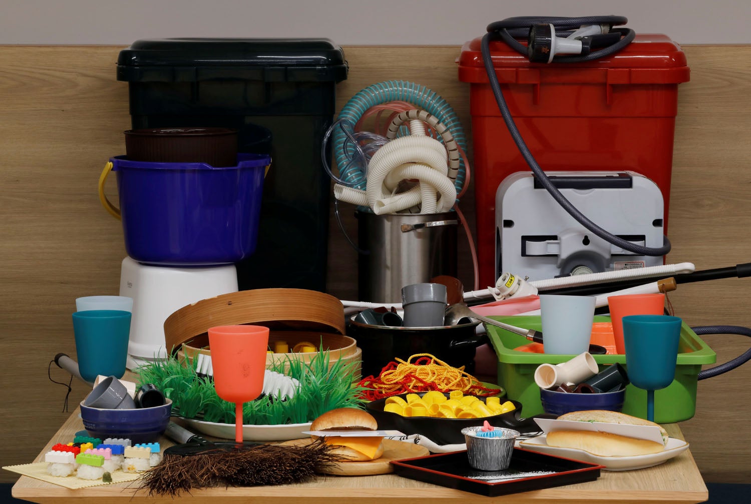 Vários artigos de plástico com 6,8 kg, equivale à quantidade de pástico que alguém pode comer em 27 anos.