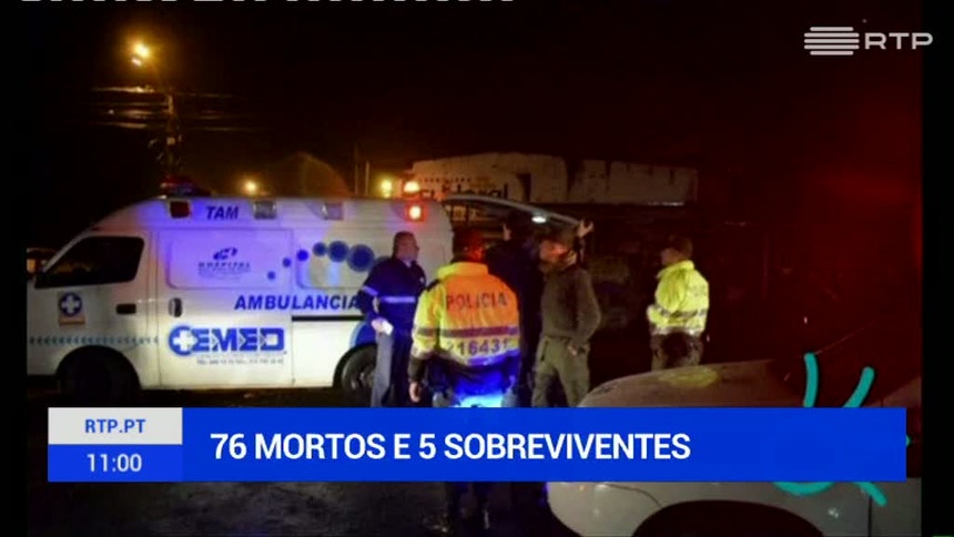 São números definitivos, 76 pessoas morreram no acidente de avião, esta noite, na Colômbia. Há cinco sobreviventes. A bordo do aparelho seguia uma equipa de futebol brasileira da primeira divisão.