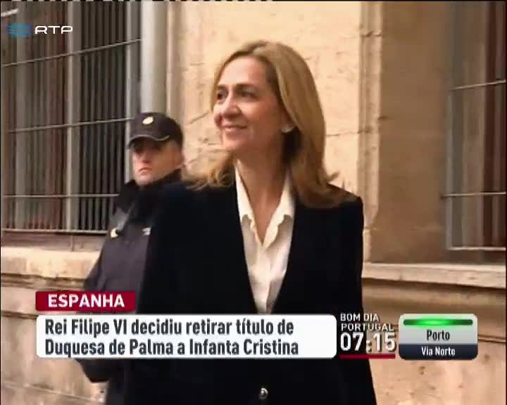 O Rei de Espanha retirou esta quinta-feira o título de duquesa de Palma à própria irmã, a infanta Cristina. Esta é uma decisão inédita na história da monarquia espanhola. O decreto que retira o título à Infanta entra esta sexta-feira em vigor. Um comunicado da Casa Real anuncia a decisão do rei, depois das notícias sobre o alegado envolvimento da infanta Cristina num escândalo de corrupção.