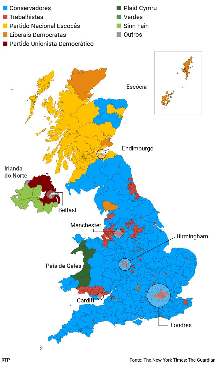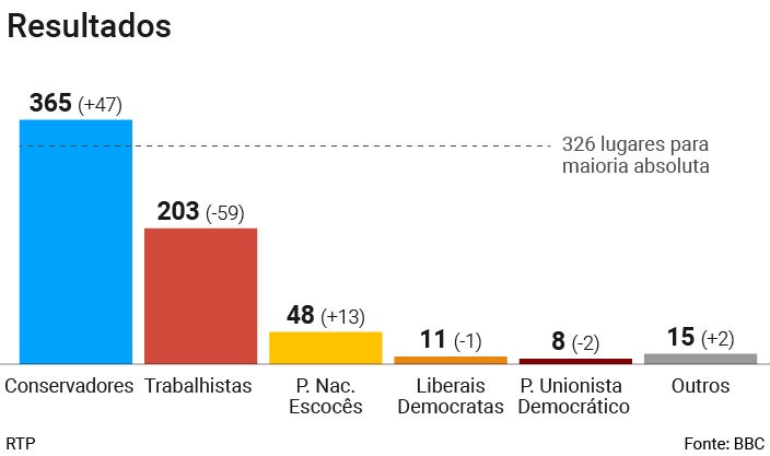 Às 8h00, já estavam apurados 648 dos 650 lugares do parlamento britânico. Os conservadores conquistam 363 lugares, mais 47 do que nas anteriores eleições. Os trabalhistas têm 203, menos 59 do que tinham.