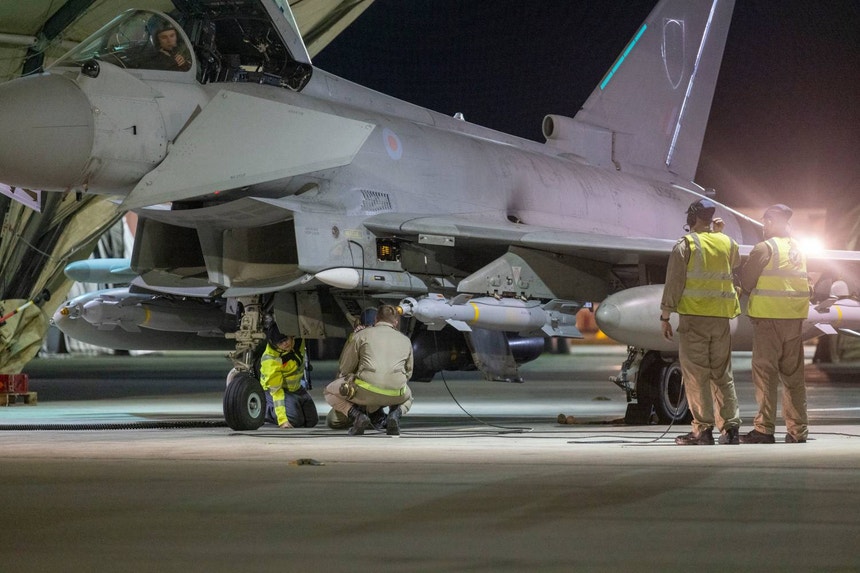 Caças Typhoon FGR4 da RAF, apoiados por um avião-cisterna, juntaram-se a aeronaves francesas num ataque conjunto, usando bombas guiadas para atingir vários túneis de acesso à instalação, disse o ministério.