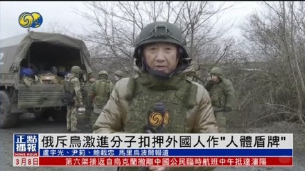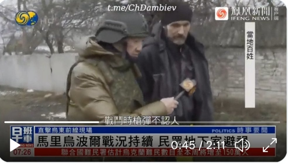 "Estou na linha de frente em Mariupol", diz o jornalista para a reportagem, perguntando a um soldado se está nervoso. O militar responde-lhe que não, porque está "a lutar há oito anos".O repórter chinês parece ser o único jornalista