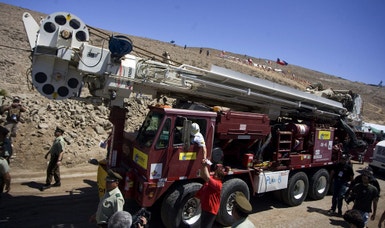 Os trabalhos para retirar os 32 mineiros chilenos e um boliviano tiveram, sábado, um momento decisivo, quando uma das três perfuradoras que escavam túneis conseguiu "romper" o tecto da galeria.